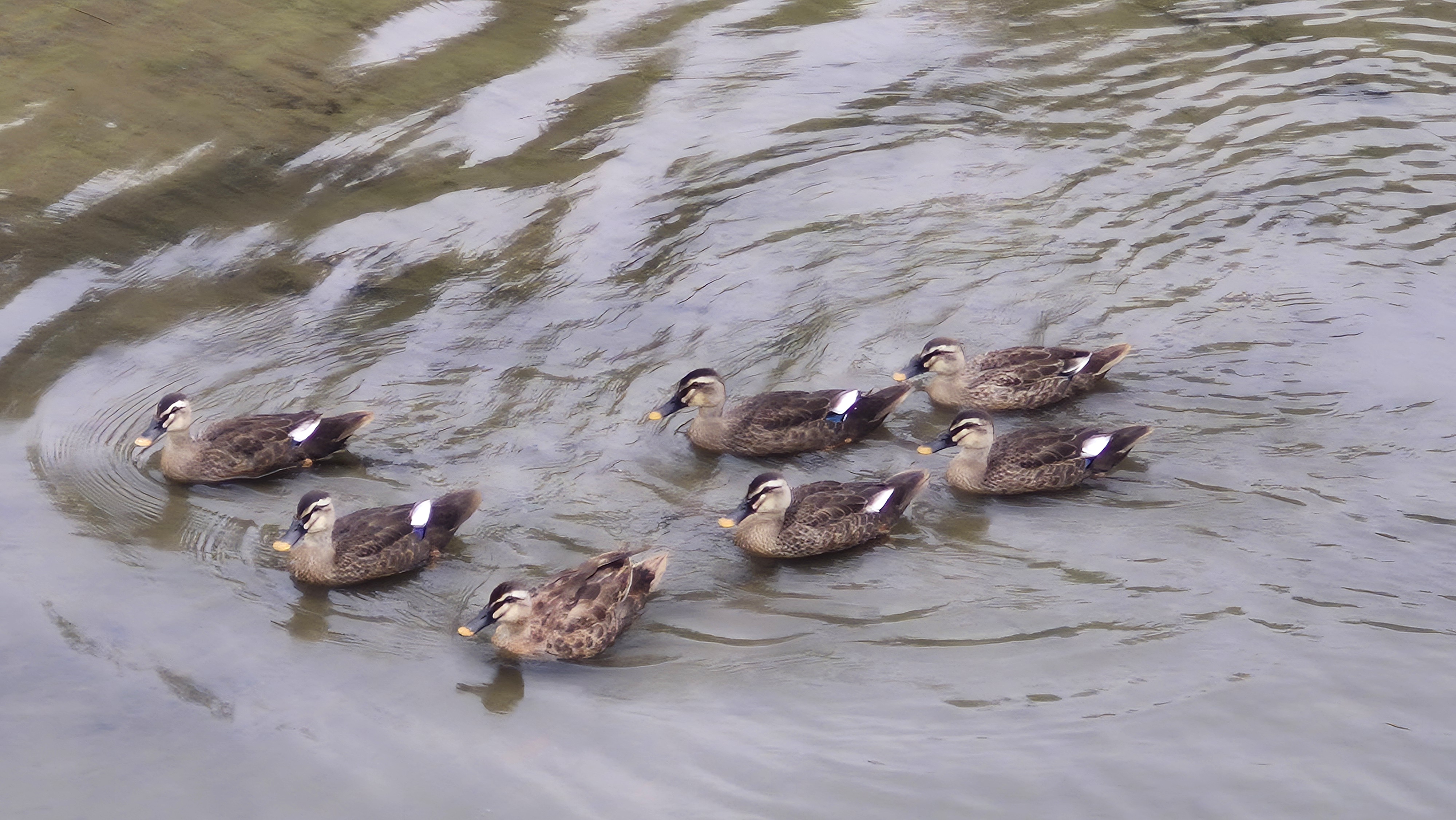 사진 속 새들은 흰뺨검둥오리(학명: Anas zonorhyncha)입니다.