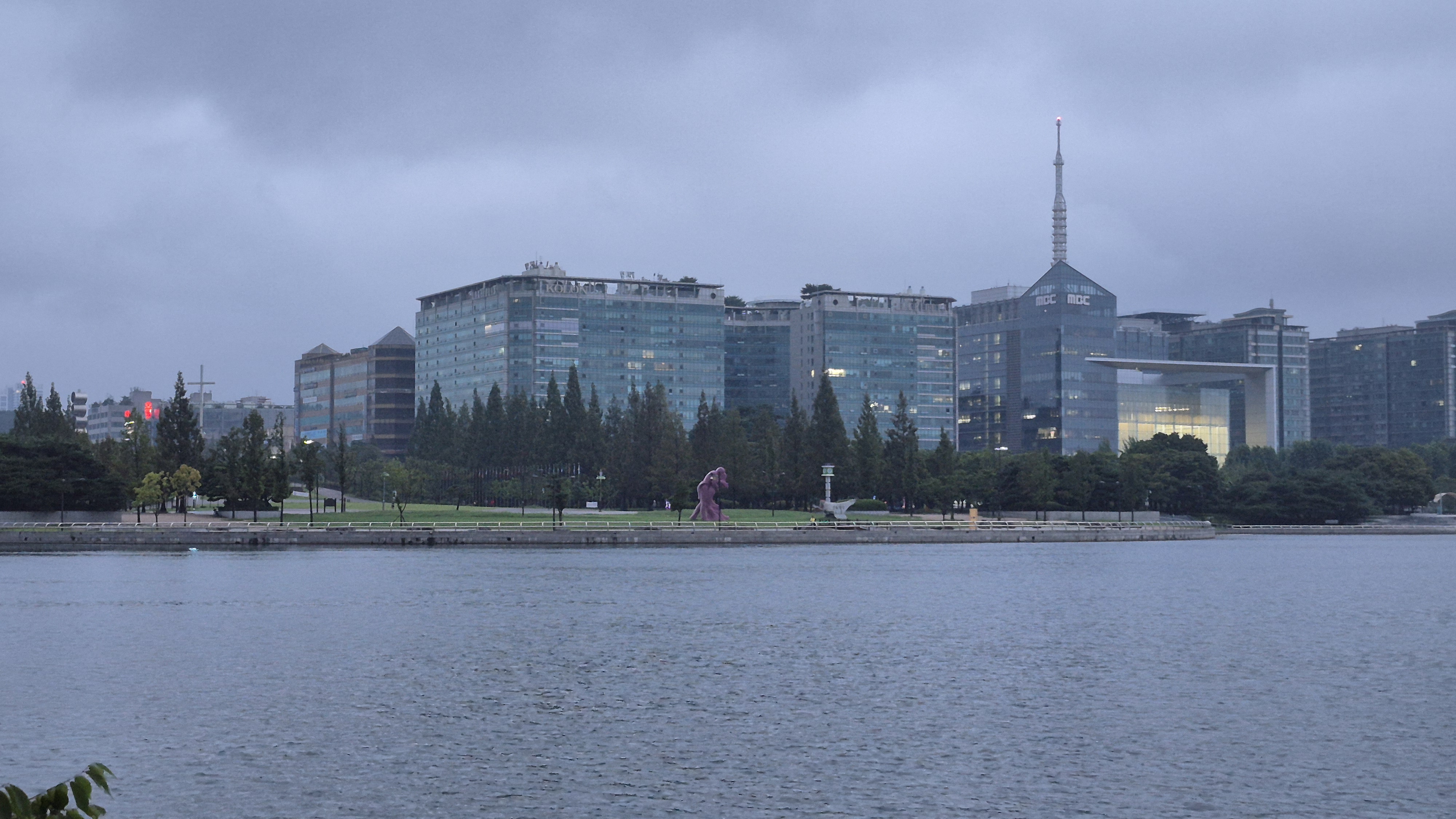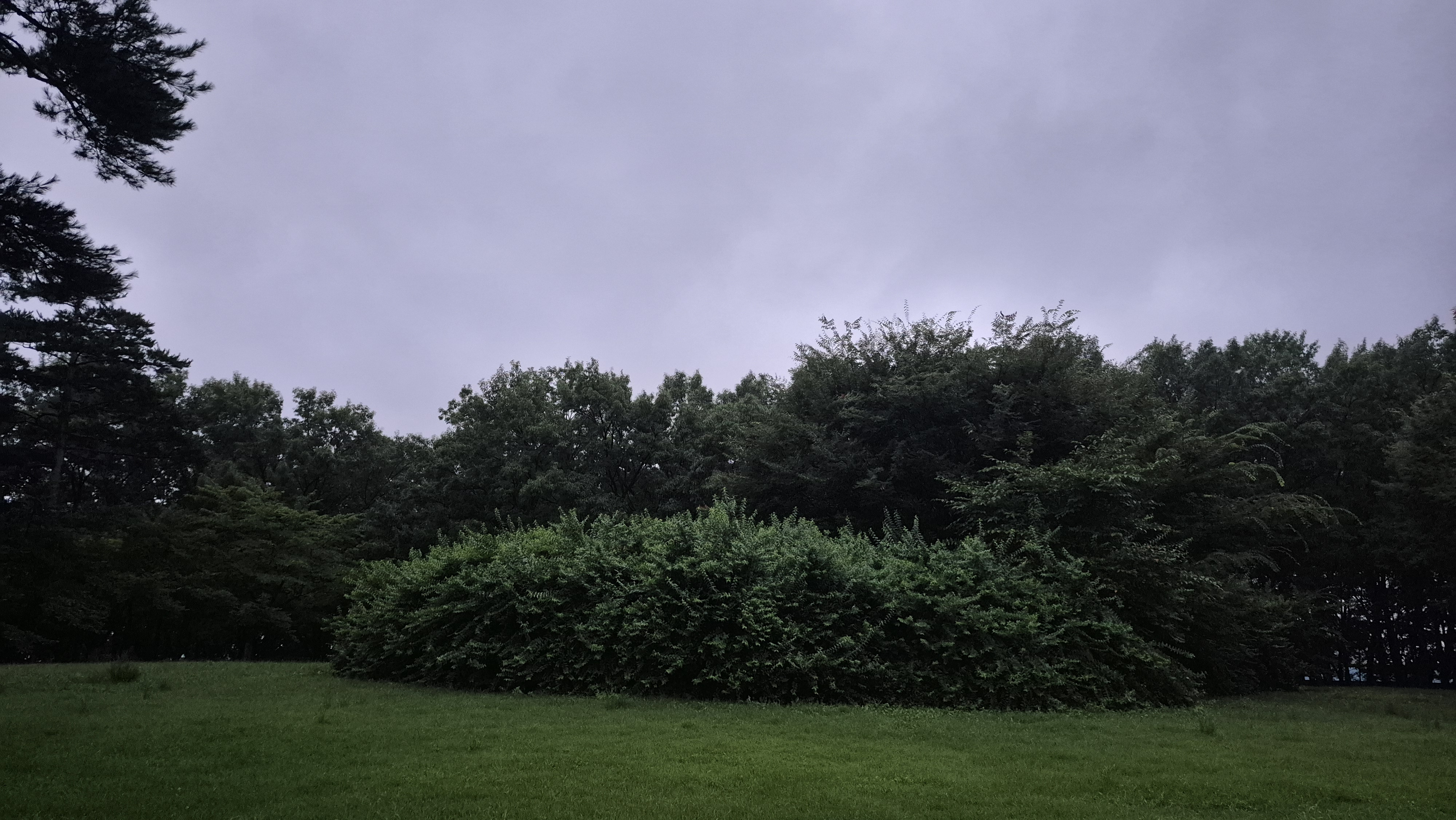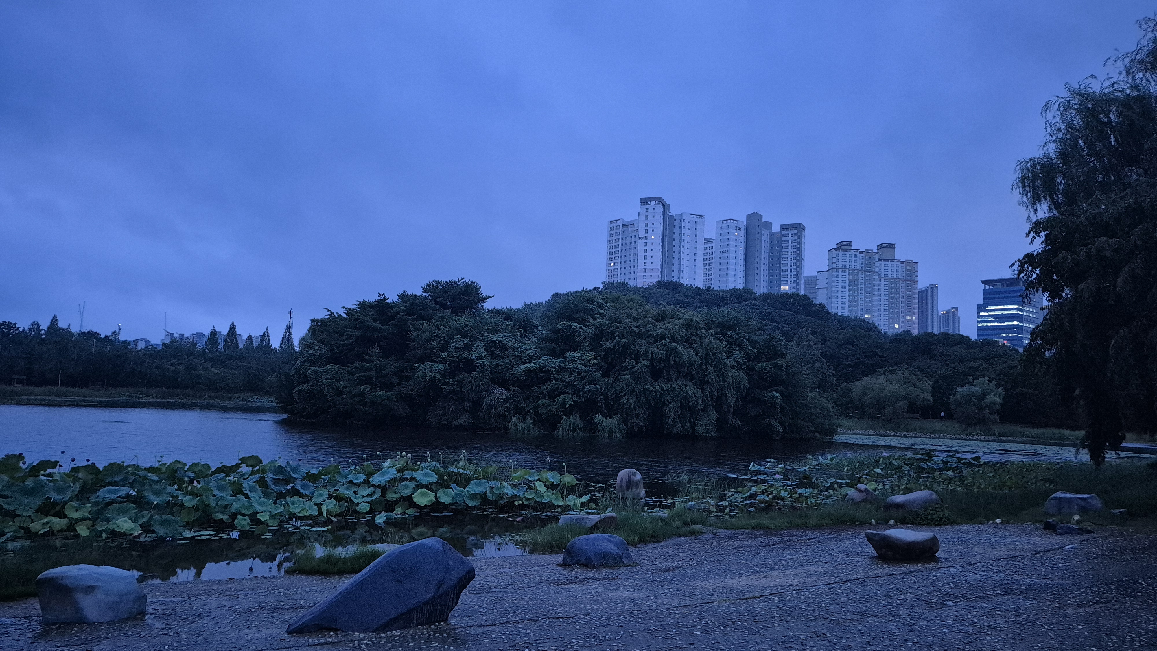 호숫가는 선선한 바람이 불고 물결은 잔잔히 인다 그에 반하여 하늘은 먹구름을 잔뜩 품고서 내려올 기세다
